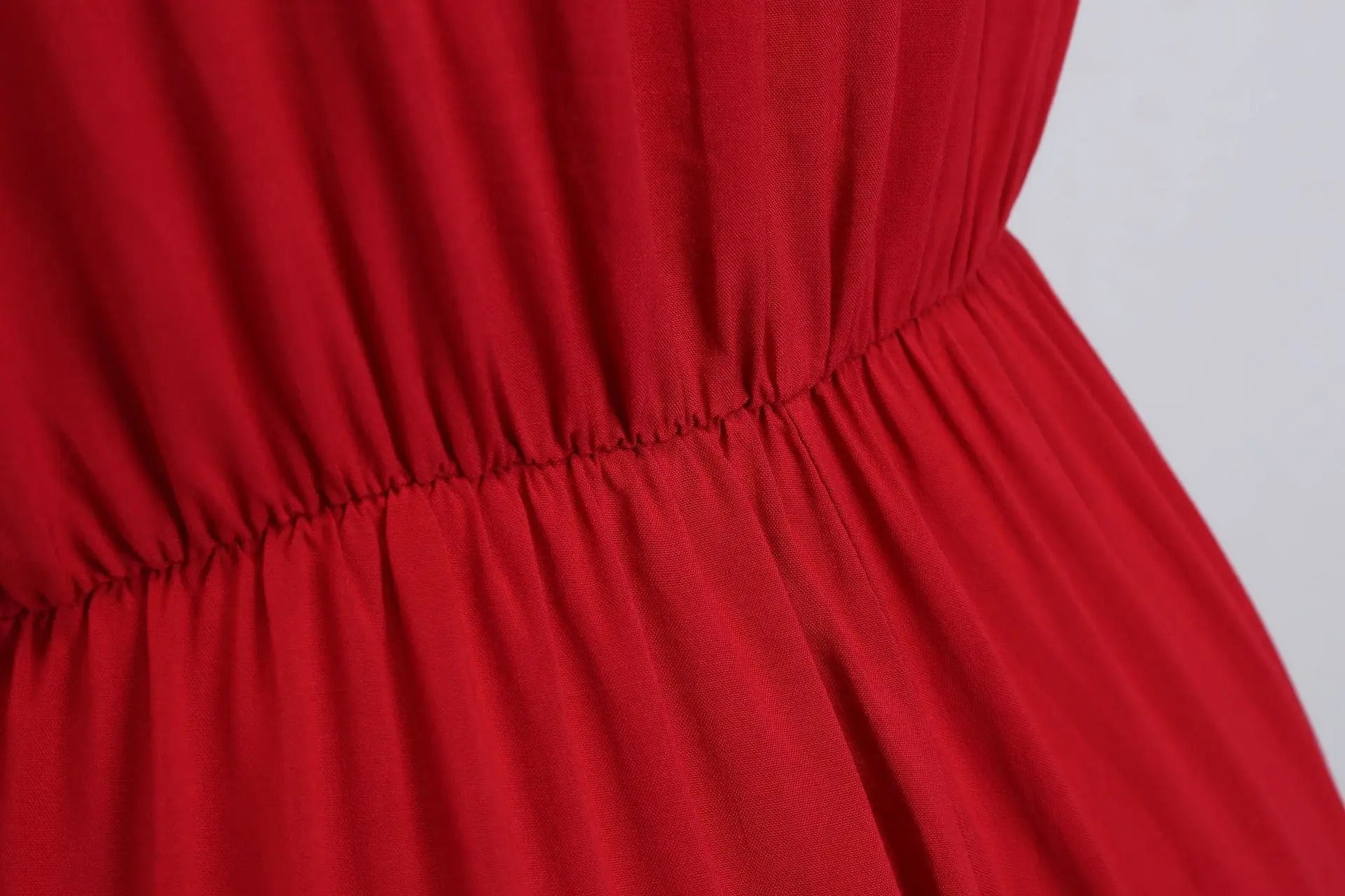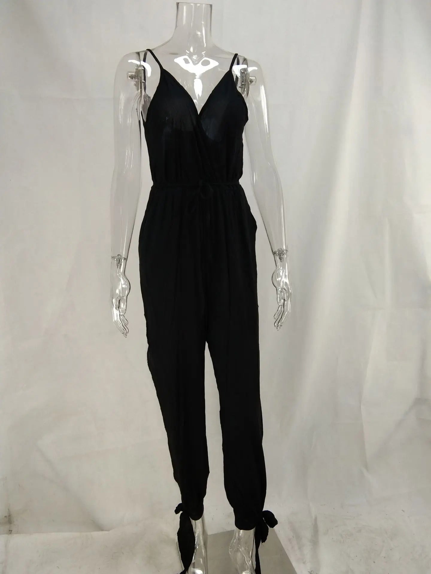 Das Oberteil hat einen Wickelstil vorne und formt einen V-Ausschnitt. Es verfügt außerdem über Schulterträger und einen leicht lockeren Schnitt. Der Jumpsuit hat einen elastischen Bund, eine Schleife, die sich im Knöchelbereich sammelt, und eine locker und frei sitzende Taille. Genießen Sie die Freiheit und das Selbstvertrauen, die er bietet, und wissen Sie, dass Sie immer mühelos schick und trendy aussehen werden.