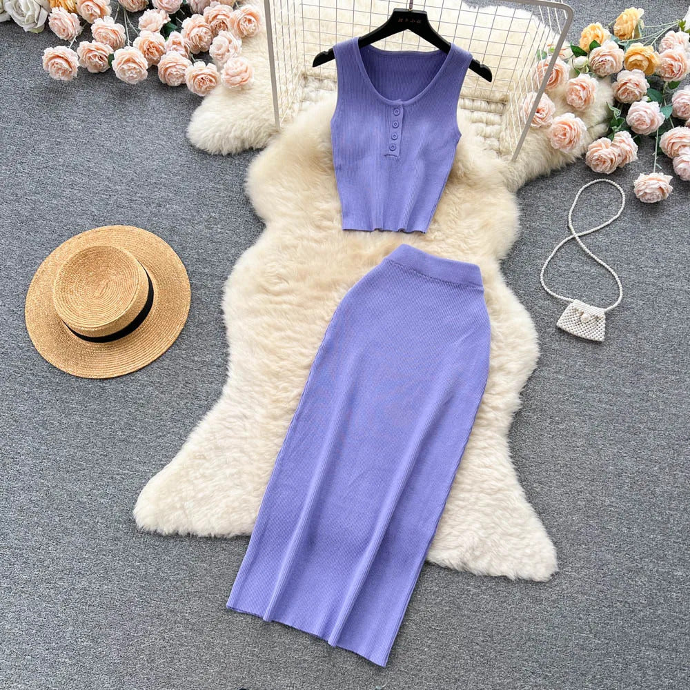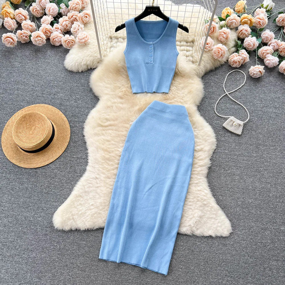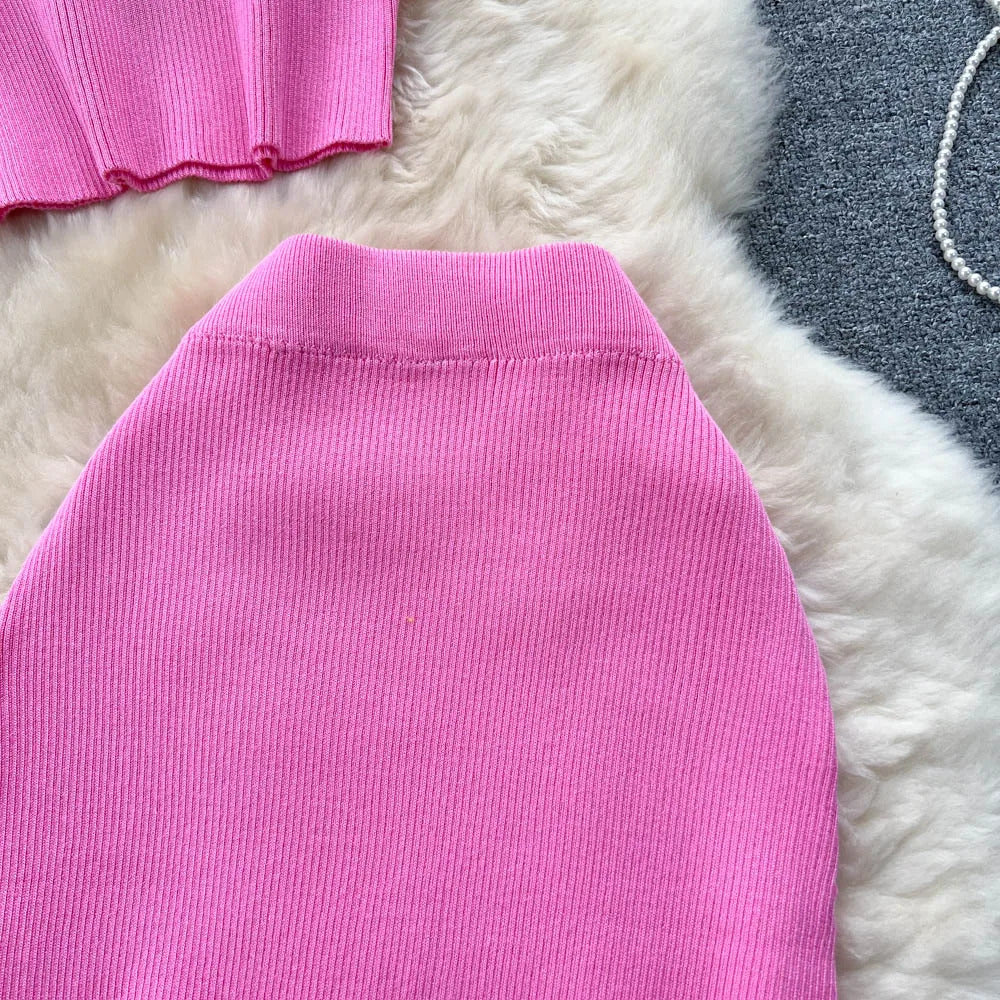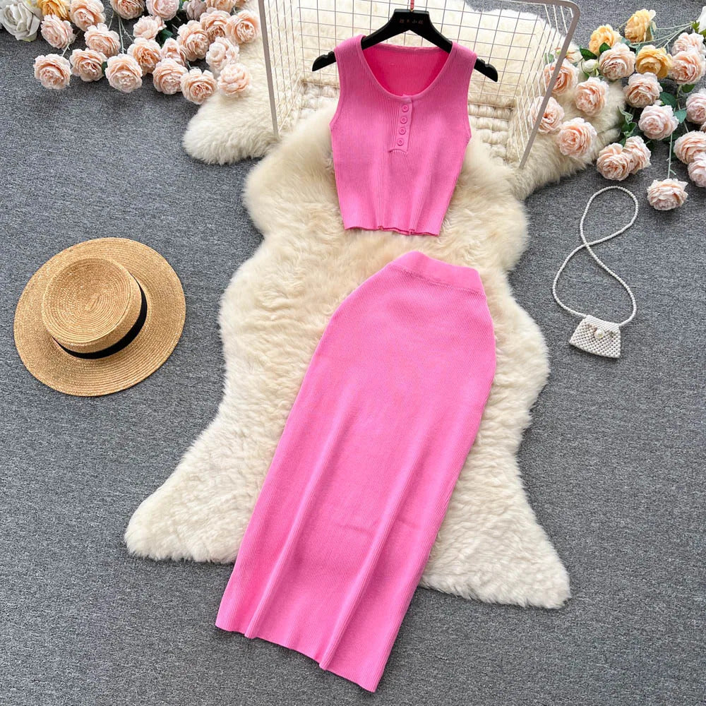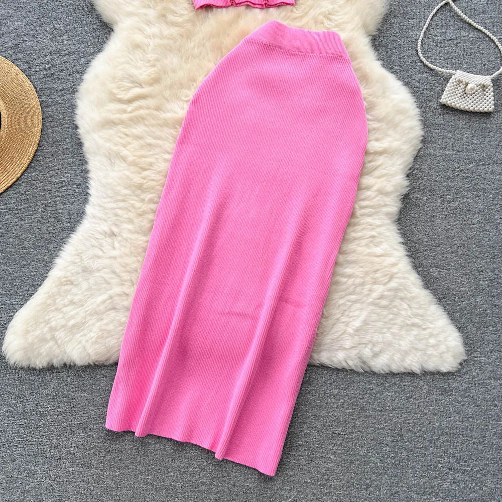 Das Set ist aus einem leichten und atmungsaktiven Stoff gefertigt. Es verfügt über ein trägerbesetztes Crop-Top mit einer eleganten Knopfleiste vorne, das sowohl Raffinesse als auch eine verspielte Ausstrahlung bietet. Der hoch taillierte, plissierte Rock ergänzt das Oberteil hervorragend und bietet einen bequemen elastischen Bund, der eine perfekte Passform für alle Körpertypen gewährleistet.