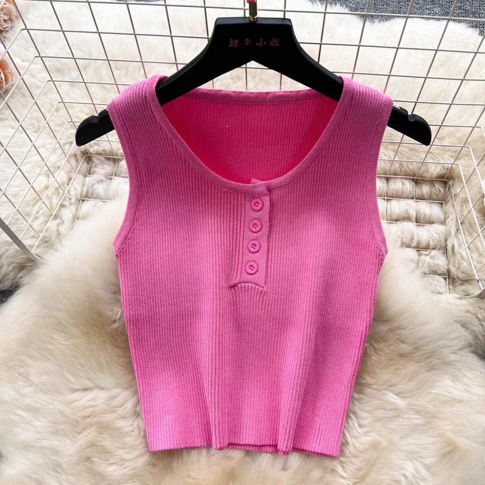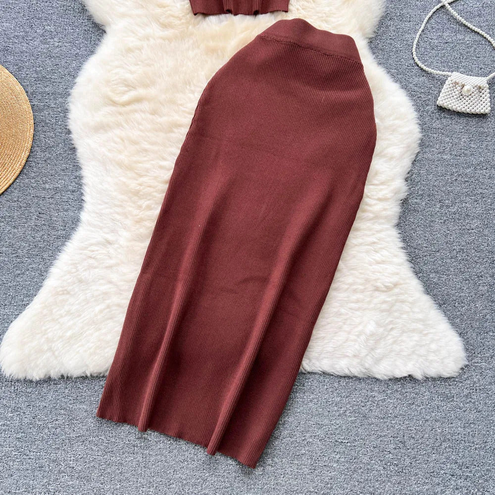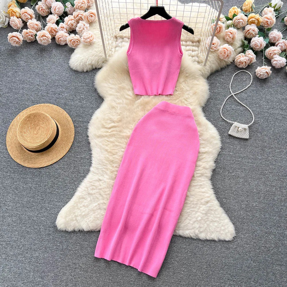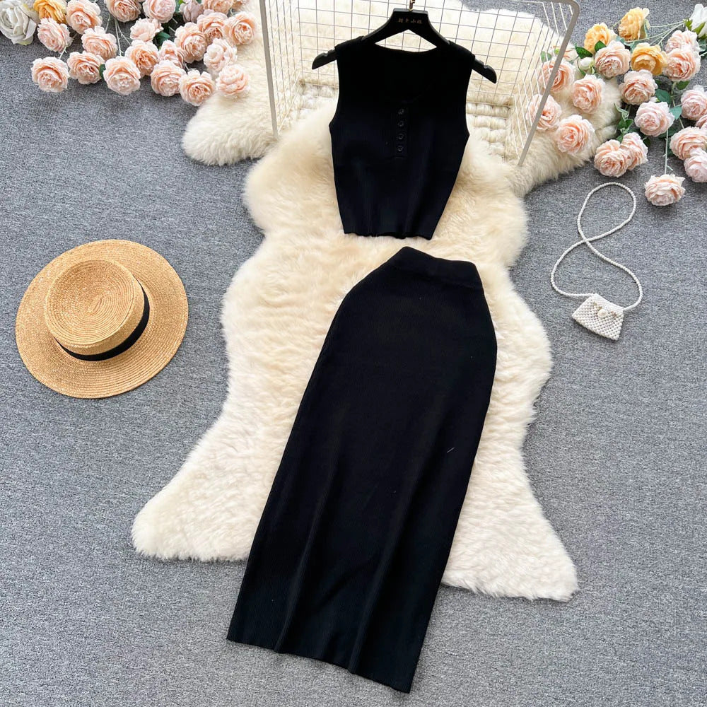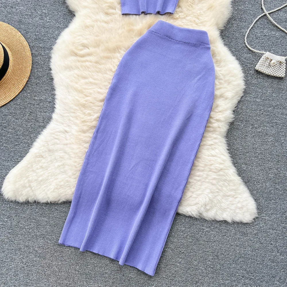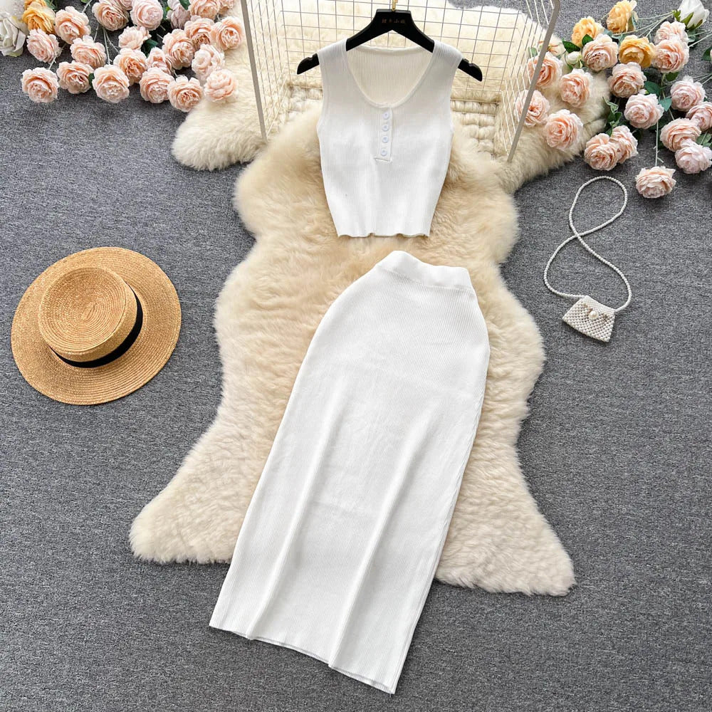 Das Set ist aus einem leichten und atmungsaktiven Stoff gefertigt. Es verfügt über ein trägerbesetztes Crop-Top mit einer eleganten Knopfleiste vorne, das sowohl Raffinesse als auch eine verspielte Ausstrahlung bietet. Der hoch taillierte, plissierte Rock ergänzt das Oberteil hervorragend und bietet einen bequemen elastischen Bund, der eine perfekte Passform für alle Körpertypen gewährleistet.